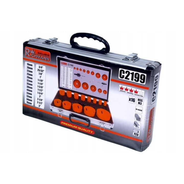 Bimetál koronafúrók fa és fém fúrásához, 16 darabos készlet, 19-76 mm, Richmann Exclusive