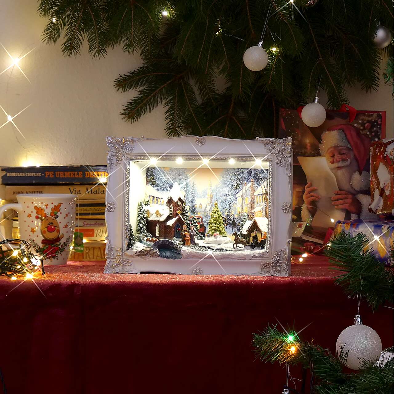 Karácsonyi dekoráció, polirezin, karácsonyi festmény, havas falu, LED, 3xAA, 28,5x8,2x21,2 cm, Magic Home