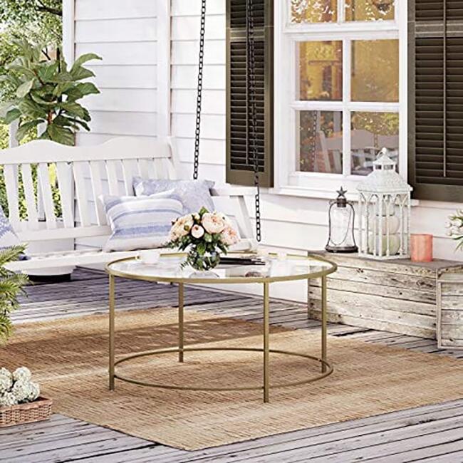 Dohányzóasztal, üveg tárolópolccal, kerek, acél, arany, 84x45,5 cm
