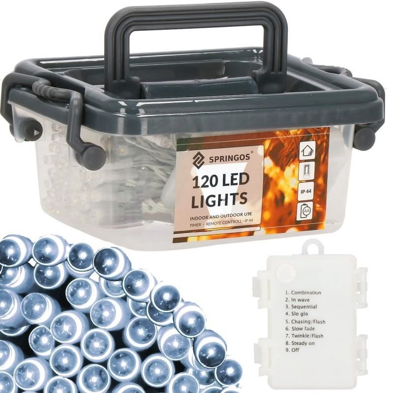 Instalatie luminoasa de Craciun, exterior/interior, 120 LED, 8 moduri, alb rece, IP44, 3xAA, 9 m