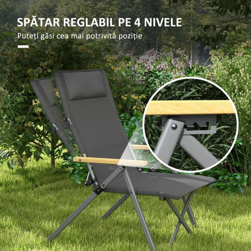 Scaun pliabil gradina, camping, pescuit, material Oxford, cu tetiera, buzunar, spatar reglabil, gri, 74x59.5x98 cm